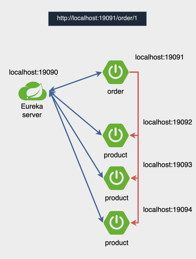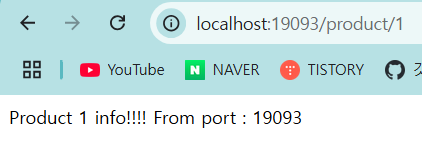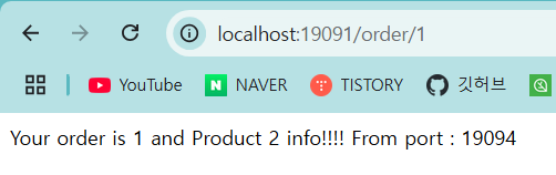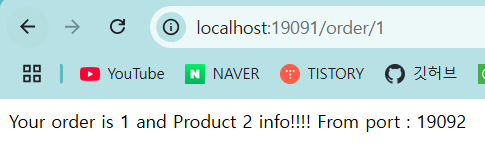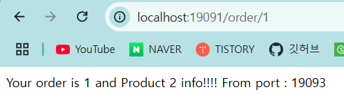 상품을 요청(http://localhost:19091/order/1) 하면 응답하는 인스턴스의 포트를 받아서 노출한다.