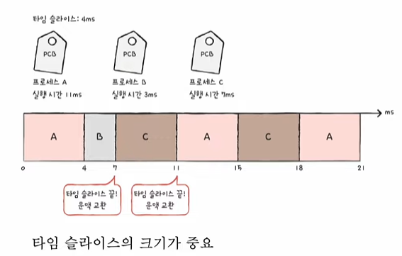 타임 슬라이스란? 각 프로세스가 CPU를 사용할 수 있는 정해진 시간이다.