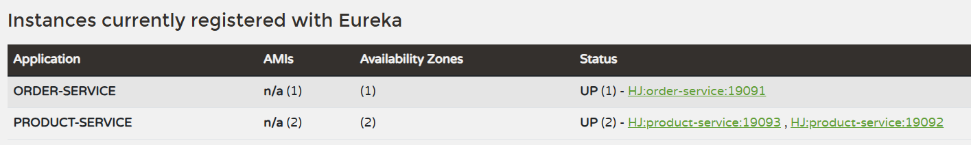 유레카 서버 하나에 Order 인스턴스 1개와 같은 기능에 포트만 다른 Product 인스턴스 3개를 연결한다.