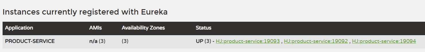 Eureka 중앙 서버로 들어가면 이렇게 product 포트 3개가 떠 있는 걸 확인할 수 있다.