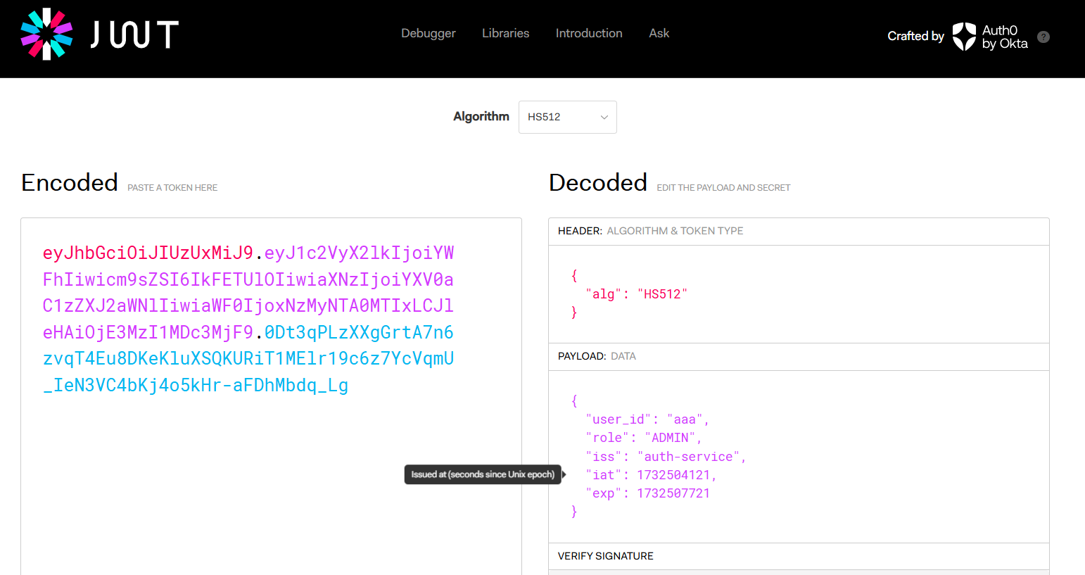 jwt 사이트에서 이를 번역하면 AuthService에서 넣었던 claims와 같은 내용을 확인할 수 있다.