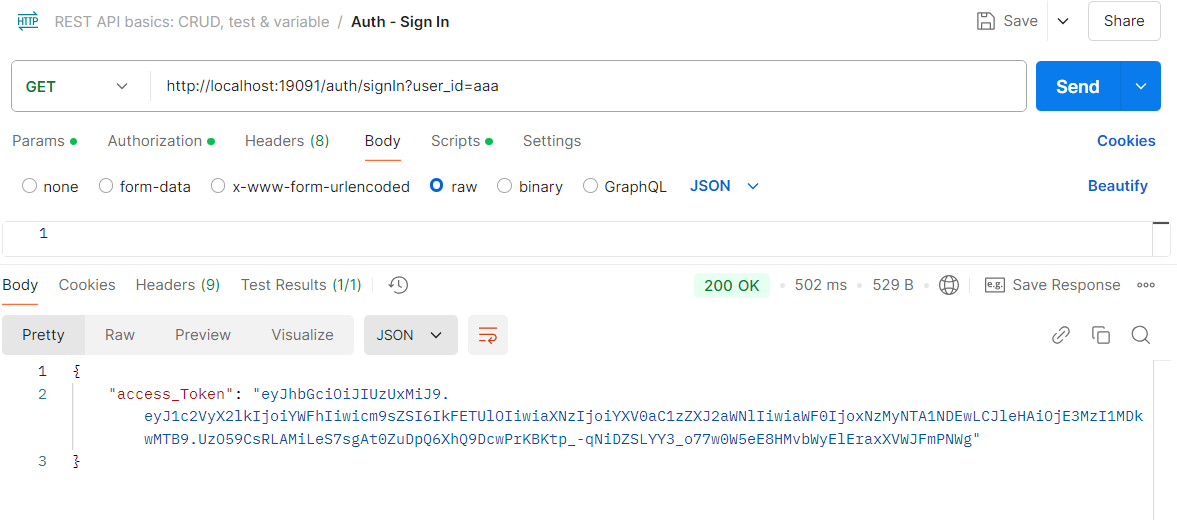 컨트롤러에서 /auth/signIn 으로 user_id 를 넘겨 로그인하도록 한다. 응답으로는 access_token을 넘겨준다.