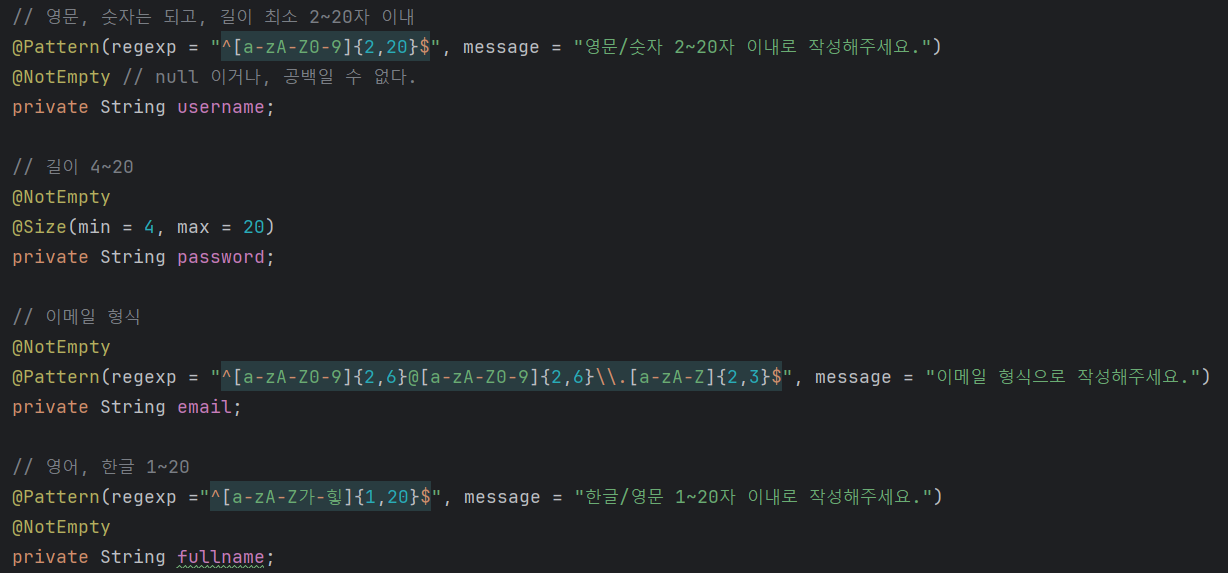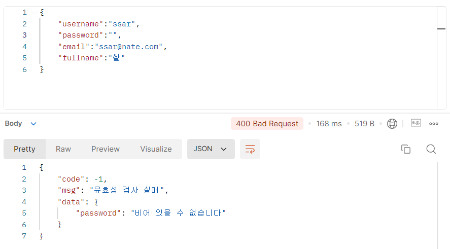 RequestDto에 제약조건을 걸어주고, 컨트롤러에서 @Valid와 BindingResult를 사용하는 방법이다.