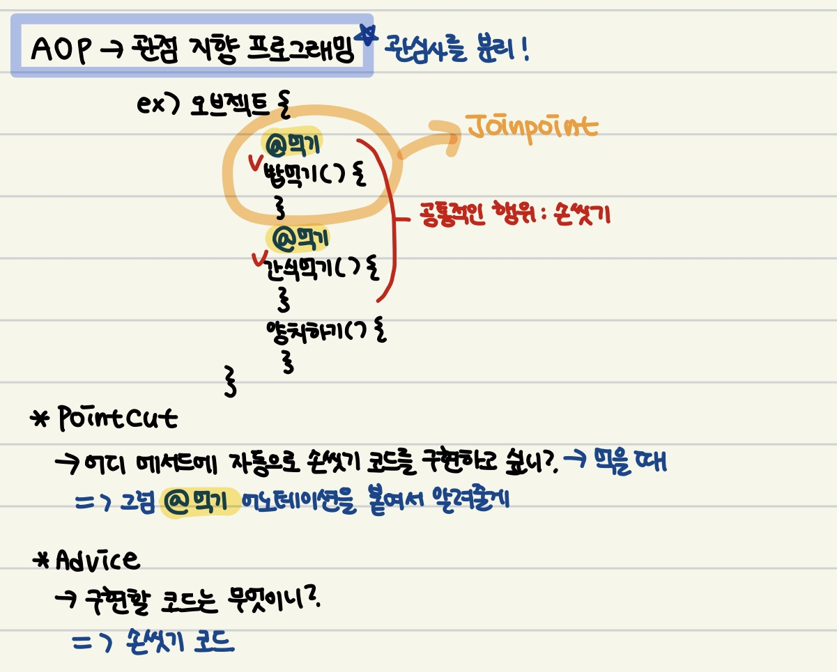 애플리케이션의 공통 관심사를 분리하여 모듈화하는 프로그래밍 기법이다. 주로 로깅, 트랜잭션 관리, 보안, 에러 처리와 같은 기능을 분리하여 깔끔하게 한곳에서 사용할 수 있다.