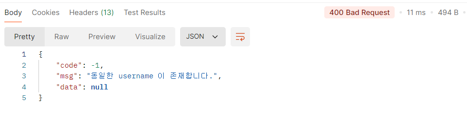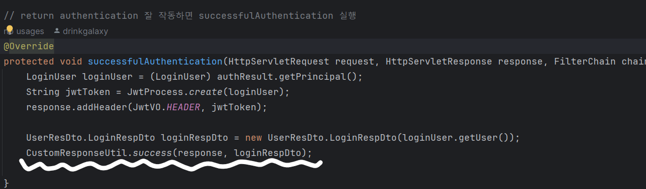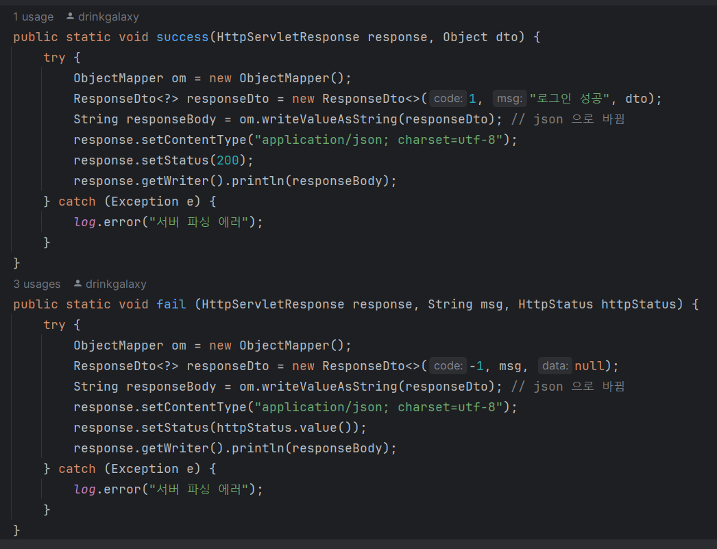 util 패키지 아래에 CustomResponseUtil 클래스를 생성하고 실패와 성공 시 응답을 각각 json으로 예쁘게 만들어준다.