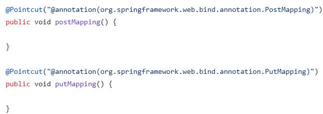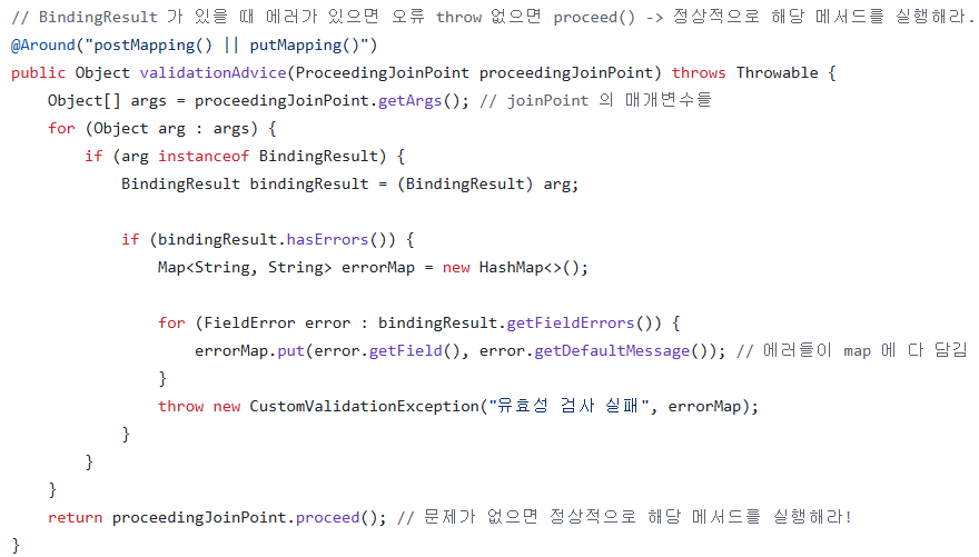 그럼 CustomValidationAdvice 클래스에서 @Pointcut 어노테이션으로 @PostMapping과 @PutMapping 어노테이션에서 AOP를 사용한다고 정의해주면 해당 어노테이션 사용때마다 검증 로직을 실행한다.